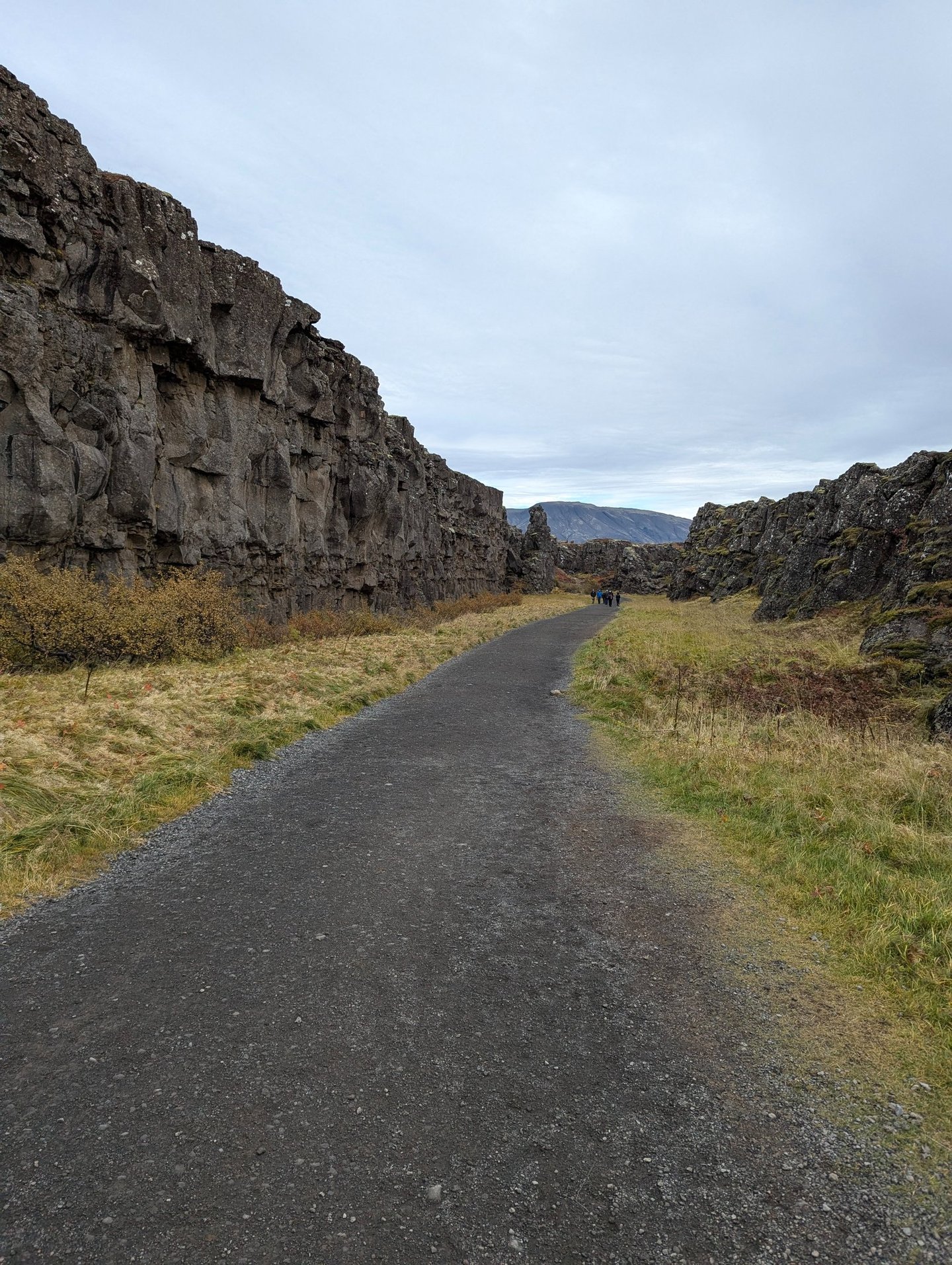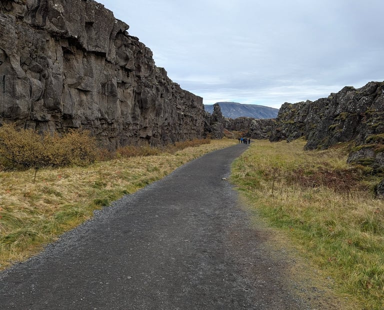 Im Anschluss setzte ich mich wieder in das Auto und fuhr zum nächsten Hotspot weiter in der Mitte Islands: Thingvellir. Thingvellir ist ein Nationalpark, der nicht nur zwei Wasserfälle beherbergt, sondern auch eine geschichtliche Bedeutung für die Wikinger hat. Das Wort „Thing“ lässt sich ableiten vom Wort „Versammlung“ und das Wort „vellir“ bedeutet „Wiesen“. An diesem Ort haben sich die Führer der Stämme Islands versammelt, um über Gesetze zu bestimmen und auch Urteile auszusprechen. Entlang riesiger Felswände ging ich zwischen den Klippen entlang Richtung eines Wasserfalls. Auf dem Weg standen auch hier Informationstafeln. An diesem Ort wurden beispielsweise auch Gesetzeslose hingerichtet. Jap, klingt jetzt nicht sehr amüsant, aber das ist jetzt mal so ein kleiner Nebenfakt. Als ich etwas weitergegangen bin, kam ich endlich an den wohl schönsten Wasserfall auf meiner bisherigen Reise an: den Öxarafoss. Ein Foto zu schießen war gar nicht so einfach, denn dieser Ort war gefüllt mit Touristen. Letztlich hat sich das Warten aber gelohnt, denn dabei ist ein tolles Bild entstanden.